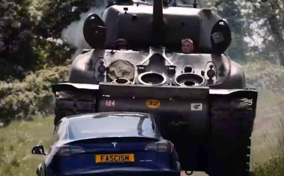 “Uangnya berasal dari Tesla. Baiklah, saya punya pesan untuk Tuan Musk: kami telah menghancurkan fasisme sebelumnya — dan kami akan melakukannya lagi,” tegas Turner, sebelum melindas sebuah mobil Tesla hingga hancur berantakan.